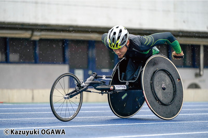 幼い頃からの腕のみの生活で鍛え上げられた筋力とバランスの良さで、車いす陸上の国際レースに挑む。